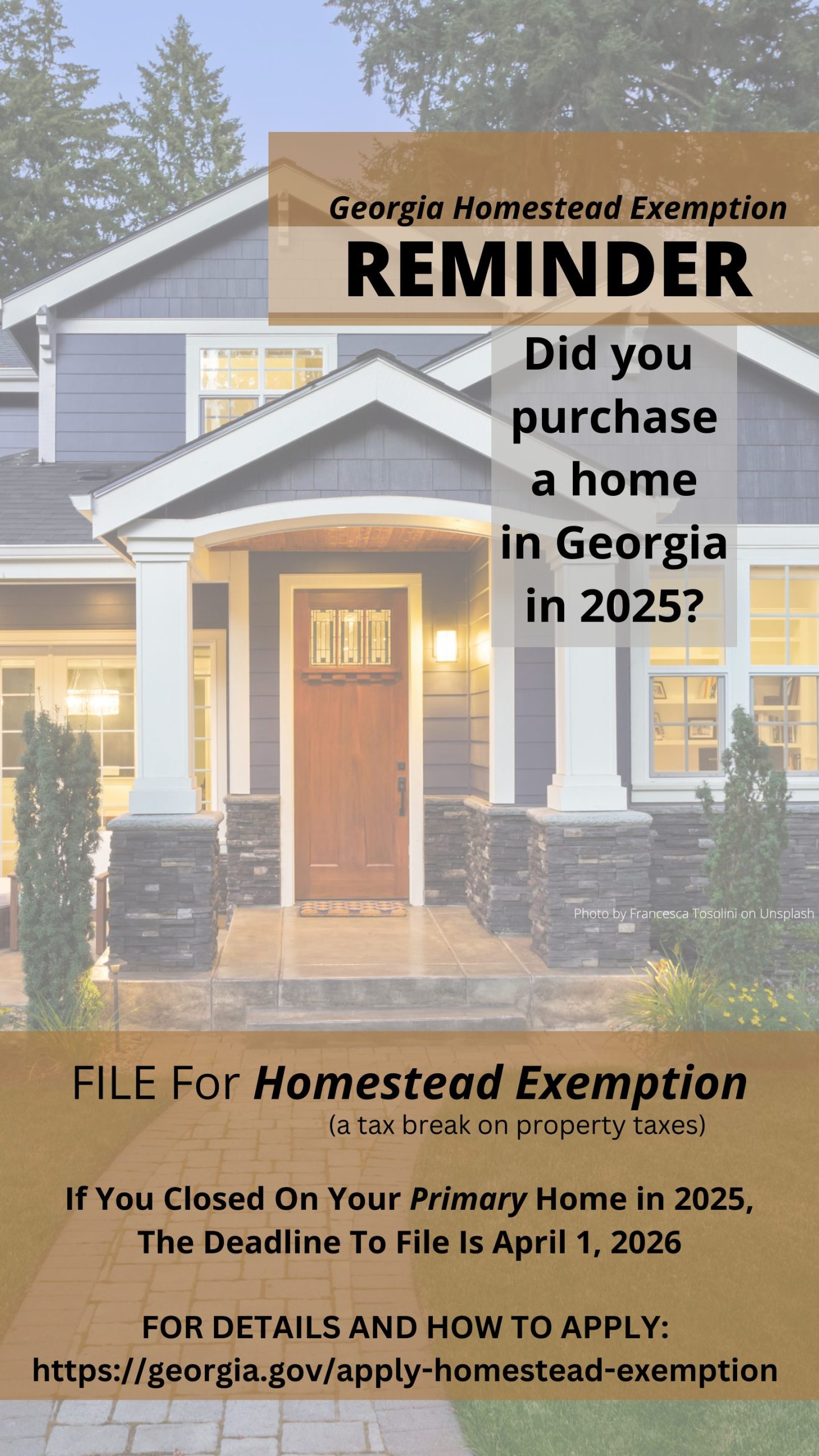 If you purchased a home in 2025, be sure to apply for Homestead Exemption. It is a way to save money on your property taxes. You can receive a tax break on your property taxes based on the assessed value of your home or homeowner age. The exemption only applies to your primary Georgia Residence. Contact your county tax assessors office for complete details on how to apply (see below).